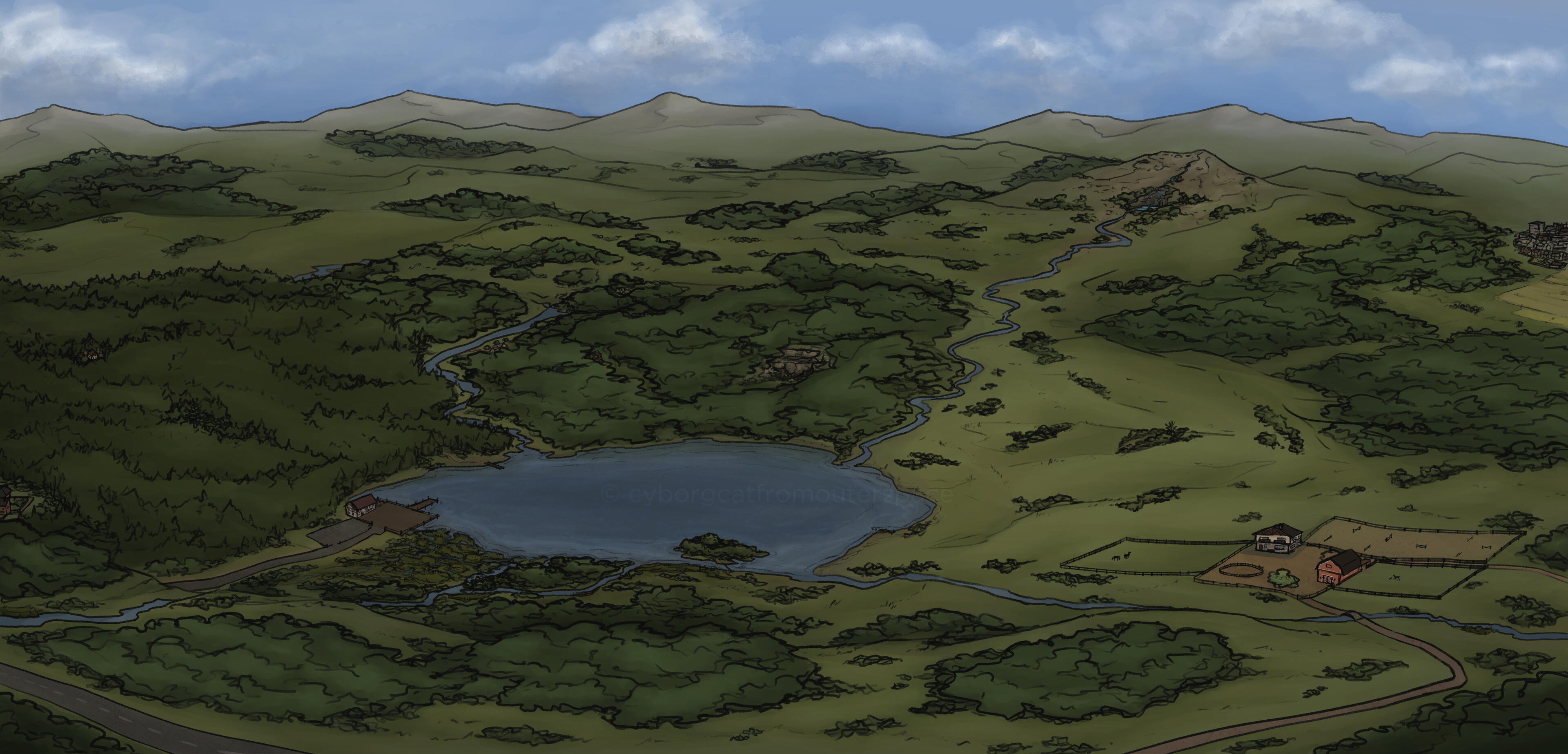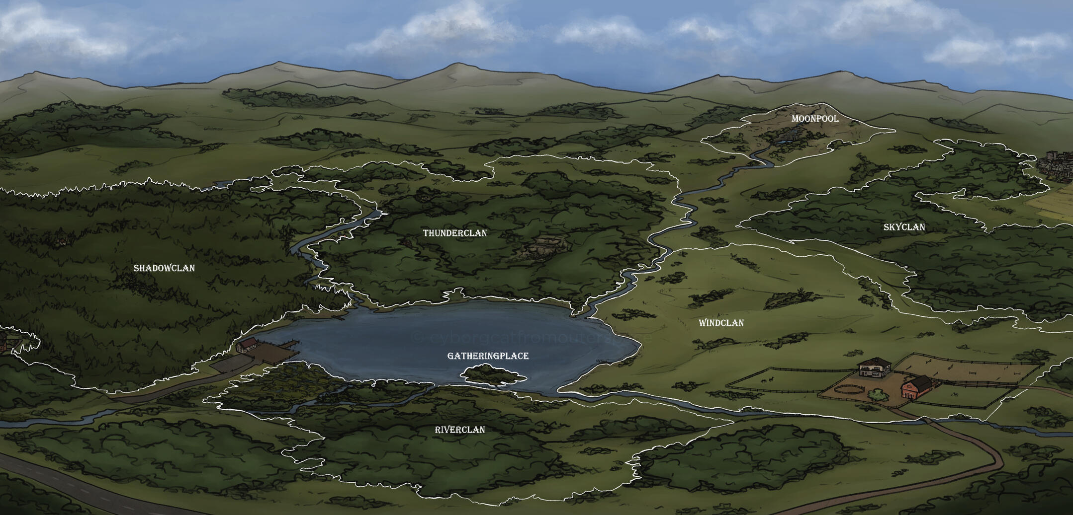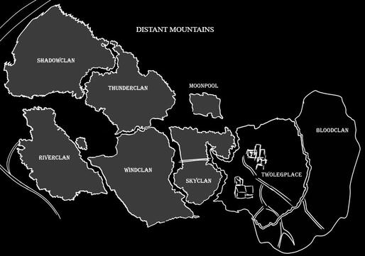 These are all the clans within the lake territories. Unlike in the books, Skyclan occupies a portion of territory that is adjacent to the other clans. Thunderclan and Shadowclan share a flooded thunderpath between their territories, Windclan occupies the moorland beside the Horseplace, and Riverclan is the smallest territory with close proximity to the gatheringplace.In this roleplay, natural borders have been broken up alongside rivers and streams because of the increasingly flooding and displacement of water from the northern peaks. These Distant Mountains are thought to be the origin of the forest clans. And venturing beyond them is thought to bring you to the territory of Starclan.