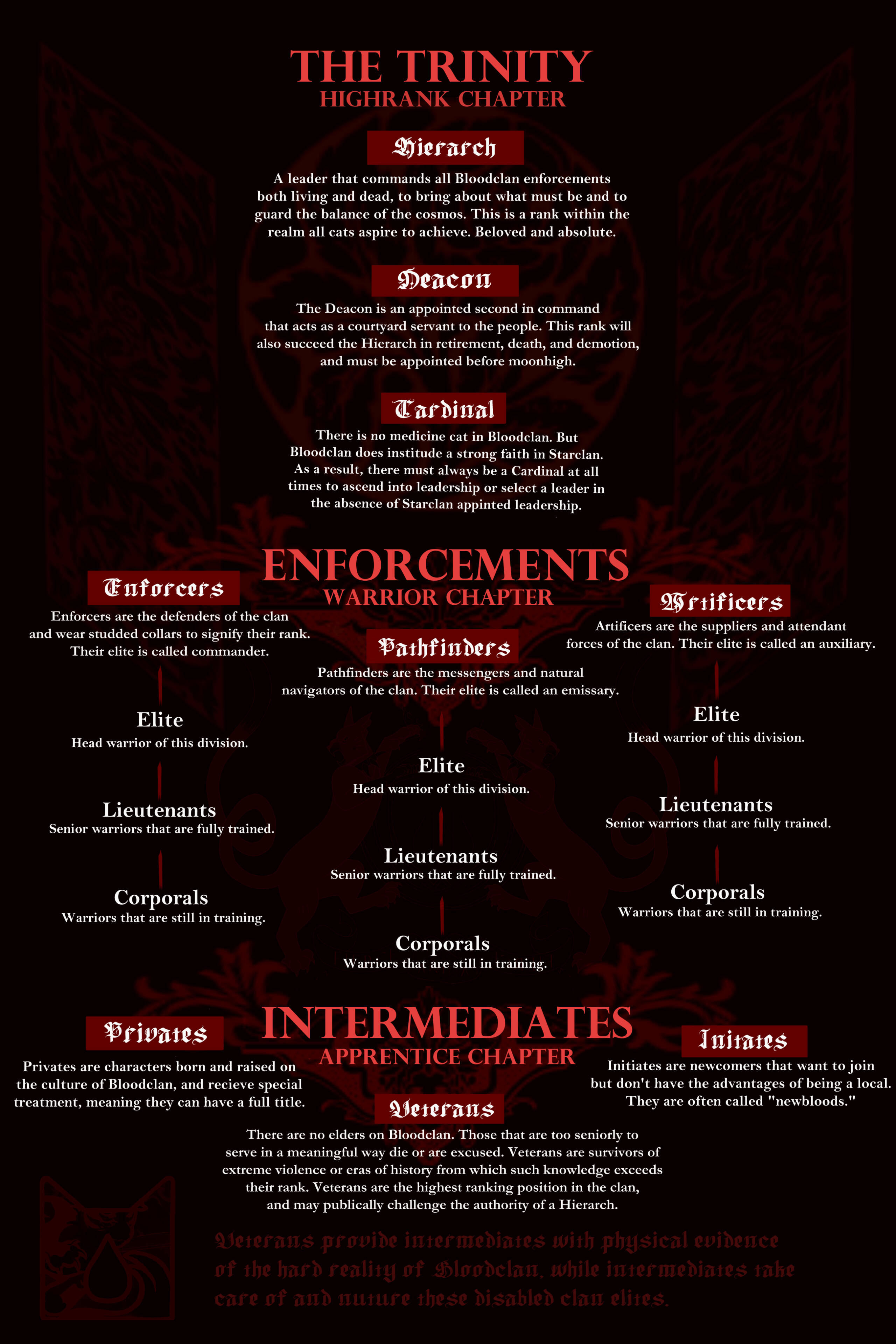 Unfortunately, this roleplay isn't just occupied by the familiar warriors we know. There are several rogue groups, loners, and kittypets. Far east of Skyclan territory, twolegplace development has taken some of the surrounding forestland. Instead of lamenting the lost of territory, Skyclan has managed to coexist with these circumstances. And thus are precented with an entirely unique challenge that all warriors hear about eventually.And this challenge is Bloodclan. The territory of twolegplace is divided down the middle between Skyclan and Bloodclan. In peacetime this balance is respected and never trespassed. But as it is, Skyclan serves as the bastion of honor against twolegplace, whereas Bloodclan carve their entire identity around it.These clans are in total constant opposition. And it will remain that way for many generations to come.
